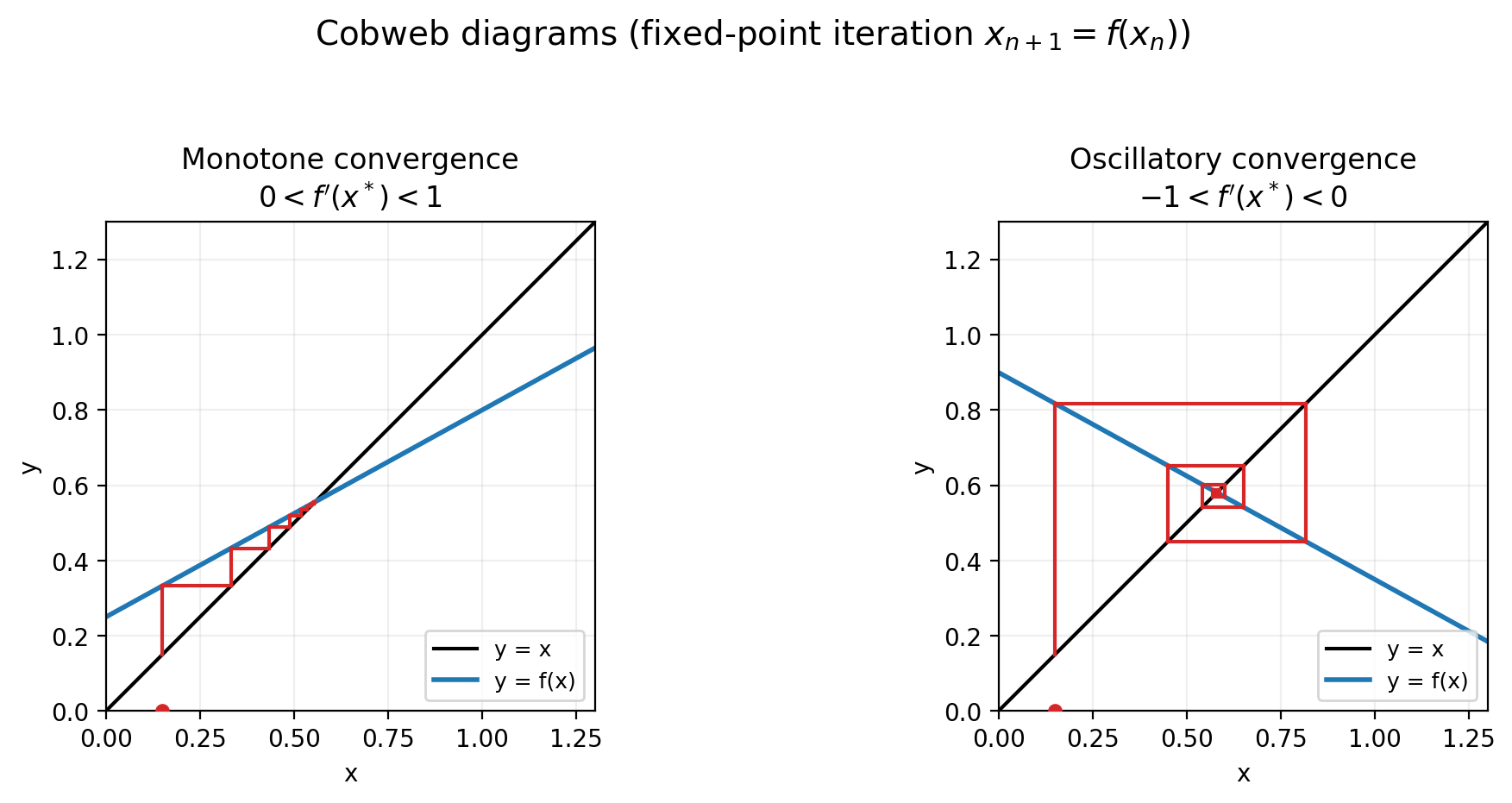 When \(|f^{\prime}(x)|<1\), the distance to the target decreases at each iteration and we have convergence.