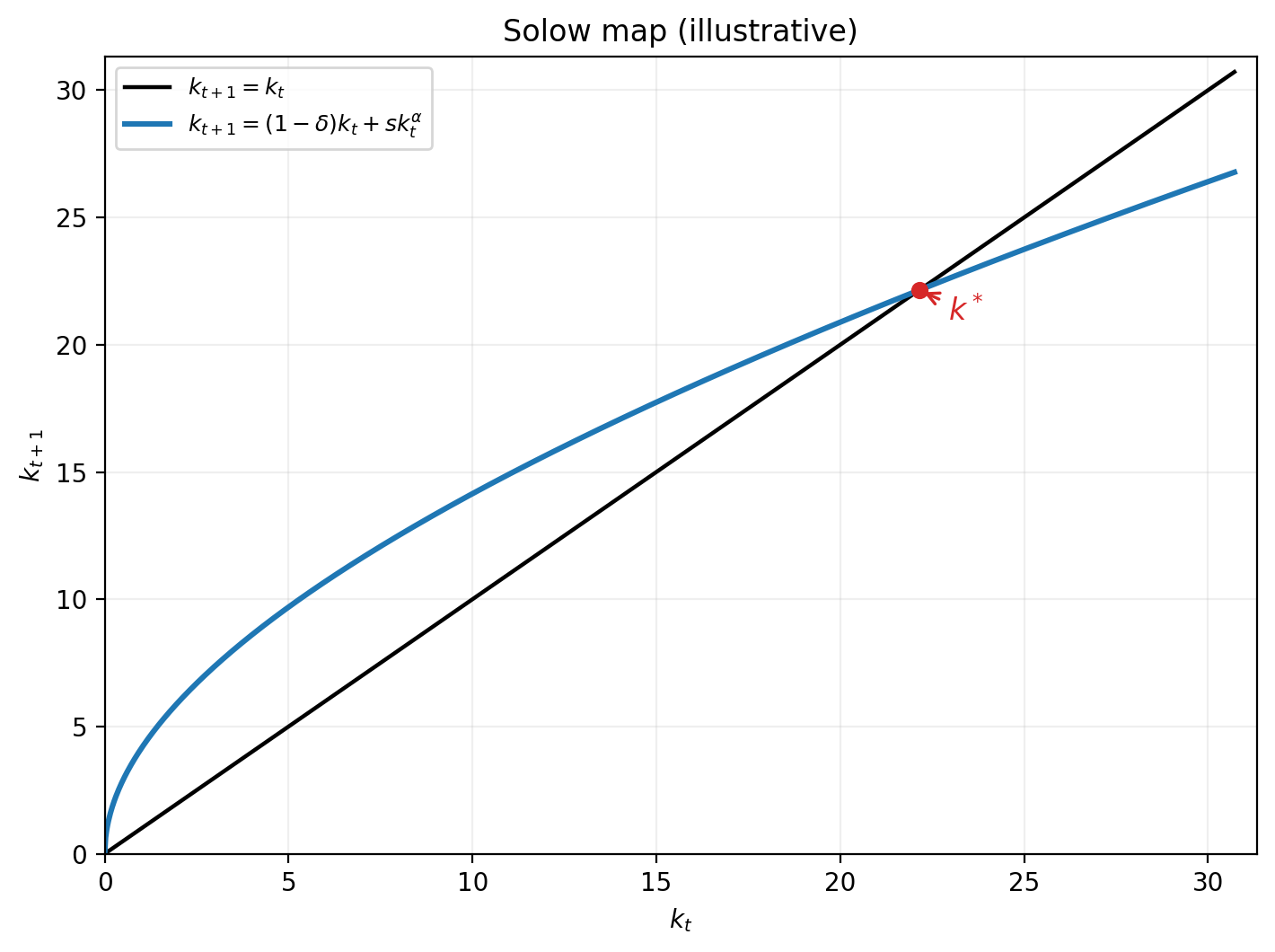 For a given value of \({\color{red} s}\in\mathbb{R}^{+}\) ( \({\color{red} s}\) is a decision rule) \[k_{t+1} = f(k_t, {\color{red} s})\]