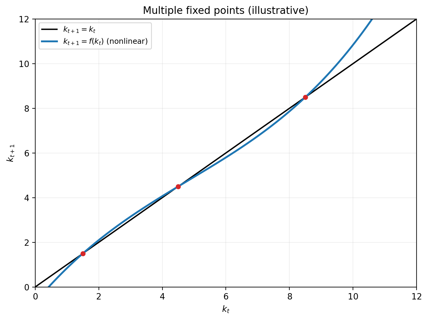 In the growth model, if we change the production function: \(y=k^{\alpha}\) for a nonconvex/nonmonotonic one, we can get multiple fixed points.